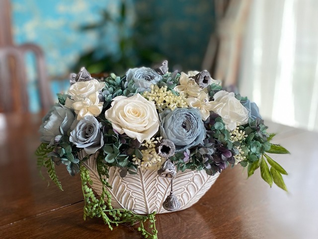 ♦︎♦︎リクエストオーダー対応品♦︎♦︎ 器はそのままに雰囲気は壊さず中に入る花の色や,材料などお値段の中で調整しお作りさせて頂きます。カラーや花材でお客様の気に入りますようメールでの画像のやり取り対応させて頂から方は制作させて頂きます。画像の商品一部は特注オーダー品のものも参考として掲載しております。特別カラーのものは花色取り寄せとなりお時間をいただく事もございます。詳しくはご相談下さい。 ※開店祝いなどお店などのテーマカラー,コンセプトカラーがおありの場合などのご注文対応致します。 ♦︎横長で低重心なフォルムは 視線を遮らず空間に驚くほど自然に馴染みます。 和室にも モダンなリビングにも。 「ジャパンディ」な空間に溶け込む花の飾り方です。日常を少しだけ特別にする 水平の美学をお届けします。 【次の用途にどうぞ】結婚祝い・母の日・お誕生日・還暦・敬老・入社・入学・退職・卒業・記念日・出産・開店・新築・出演・公演・お見舞いに 包材/クリアケース入り ■商品サイズ:約横幅35cm × 奥行13cm×高さ14㎝ ■クリアケースサイズ:横幅38cm × 奥行16cm×高さ20㎝ ■花材:プリザローズ プリザアジサイ 小花フェイク 自然素材ドライフラワー リボンなど オリエンタルな陶器製の器 ※基本のバラなどは変わらず小花などはカラーに合わせたもので色合わせ致します。クオリティはそのままに掲載品と違う事もございます。ご希望があれば発送前に確認画像などをお送り致します。 【オーダーメイドに関する説明と可否】 ※自然素材の性質上同じ素材でも色やサイズが見え方が異なります。 ※お届けまで5日間ほどお待ちいただきます在庫のない商品オーダー品の場合は制作に時間のかかるものもございますので日程などはご連絡致します。