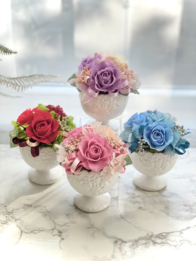 【次の用途にどうぞ】結婚祝い・母の日・お誕生日・還暦・敬老・入社・入学・送別の花・退職・卒業・記念日・出産・開店・新築・出演・公演・お見舞いに 包材/クリアケース入り ■クリアケースサイズ:約15cm × 15cm×H20cm ■商品サイズ: 約w14cm × D10cm×H13㎝ ■花材:プリザローズ プリザアジサイ 小花フェイク 自然素材ドライフラワー リボンなど 白の陶器製ベース ■カラーについて カテゴリーに示していない色は(カテゴリーその他)を選びフォームにてリクエスト下さい。制作前にメール画像にてカラーのご確認もできます。 ※基本のバラなどは変わらず小花などはカラーに合わせたものでバランスをとりますので変更する事がございます。ご了承下さい。 【オーダーメイドに関する説明と可否】 ※自然素材の性質上同じ素材でも色やサイズが見え方が異なります。 ※お届けまで5日間ほどお待ちいただきます在庫のない商品オーダー品の場合は制作に時間のかかるものもございますので日程などはご連絡致します。