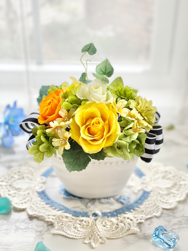 〜華やかなシーンに似合う花〜 ローマ様式の神殿を思わせるフォルムの花器はより花を美しく華やかに魅せます。記念品やお祝い品に 【次の用途にどうぞ】結婚祝い・母の日・お誕生日・還暦・敬老・入社・入学・送別の花・退職・卒業・記念日・出産・開店・新築・出演・公演・お見舞いに 包材/クリアケース入り ■クリアケースサイズ:18cm × 18cm×H30cm ■商品サイズ: 約w16cm × D16cm×H25㎝ ■花材:プリザローズ プリザアジサイ 小花フェイク 自然素材ドライフラワー リボンなど 陶器製のベース ■カラーについて カテゴリーに示していない色は(カテゴリーその他)を選びフォームにてリクエスト下さい。制作前にメール画像にてカラーのご確認もできます。 ※基本のバラなどは変わらず小花などはカラーに合わせたものでバランスをとりますので変更する事がございます。ご了承下さい。 【オーダーメイドに関する説明と可否】 ※自然素材の性質上同じ素材でも色やサイズが見え方が異なります。 ※お届けまで5日間ほどお待ちいただきます在庫のない商品オーダー品の場合は制作に時間のかかるものもございますので日程などはご連絡致します。メロウな気分に〜 メロウ(mellow)」「柔らかい」「まろやかな」「心地よい」といった意味を持つ言葉です。優しいまるいフォルムの花でリラックスして下さい。 大切な人への花ギフトとして 【次の用途にどうぞ】結婚祝い・母の日・お誕生日・還暦・敬老・入社・入学・送別の花・退職・卒業・記念日・出産・開店・新築・出演・公演・お見舞いに 包材/クリアケース入り ■クリアケースサイズ:18cm × 18cm×H25cm ■商品サイズ: 約w17cm × D13cm×H16㎝ ■花材:プリザローズ プリザアジサイ 小花フェイク 自然素材ドライフラワー リボンなど 陶器製のベース ■カラーについて カテゴリーに示していない色は(カテゴリーその他)を選びフォームにてリクエスト下さい。制作前にメール画像にてカラーのご確認もできます。 ※基本のバラなどは変わらず小花などはカラーに合わせたものでバランスをとりますので変更する事がございます。ご了承下さい。 【オーダーメイドに関する説明と可否】 ※自然素材の性質上同じ素材でも色やサイズが見え方が異なります。 ※お届けまで10日間ほどお待ちいただきます在庫のない商品オーダー品の場合は制作に時間のかかるものもございますので日程などはご連絡致します。