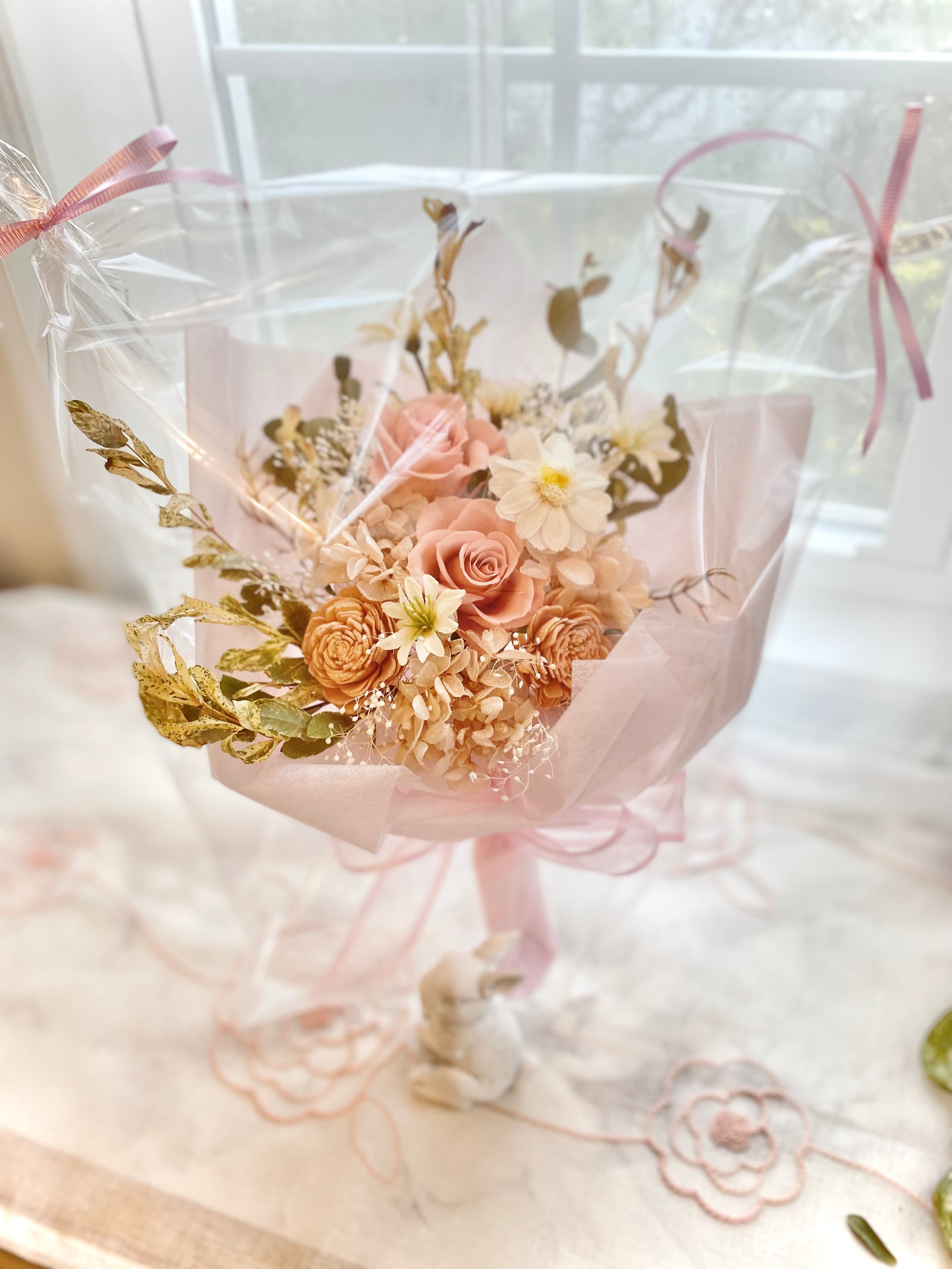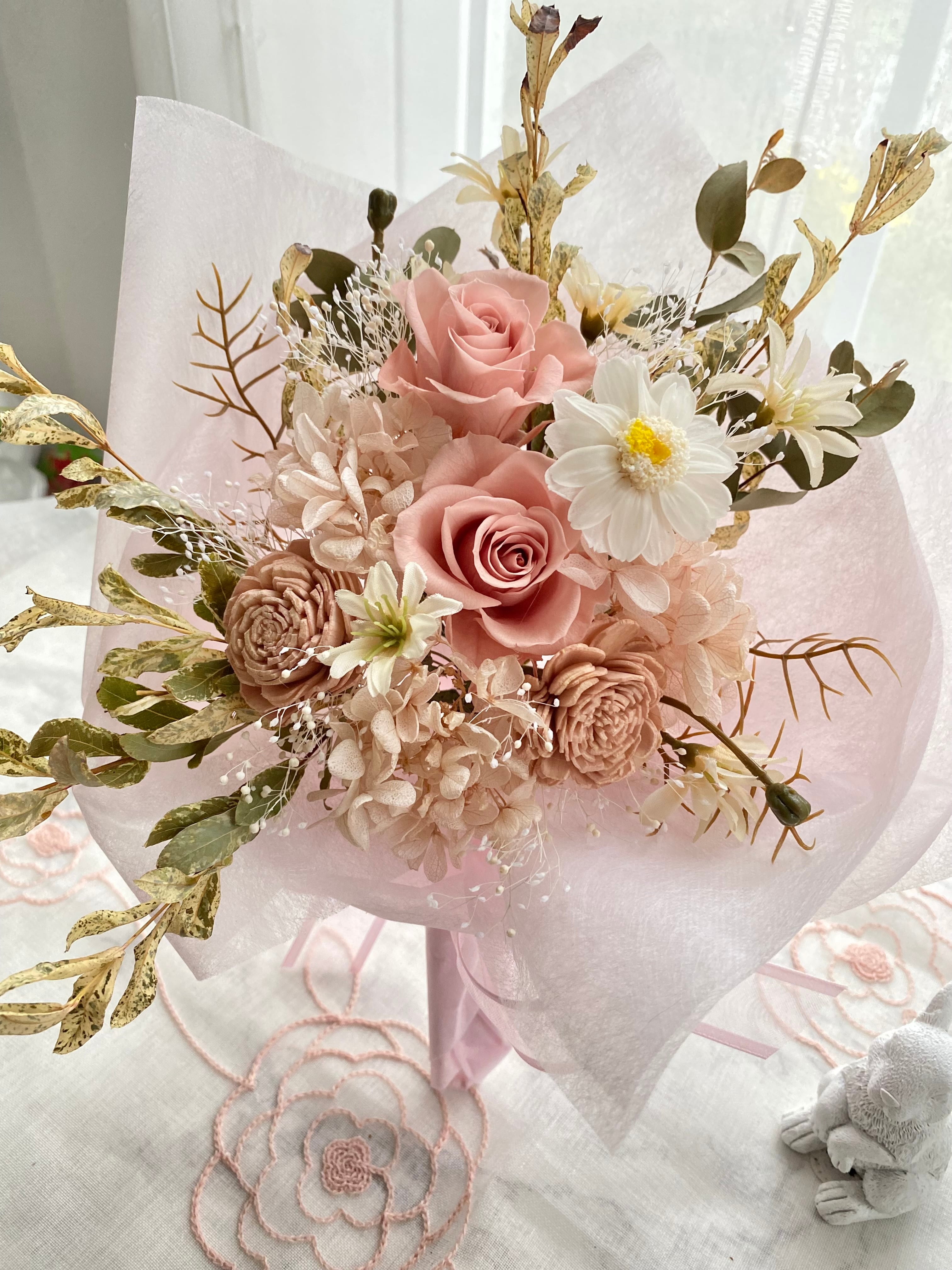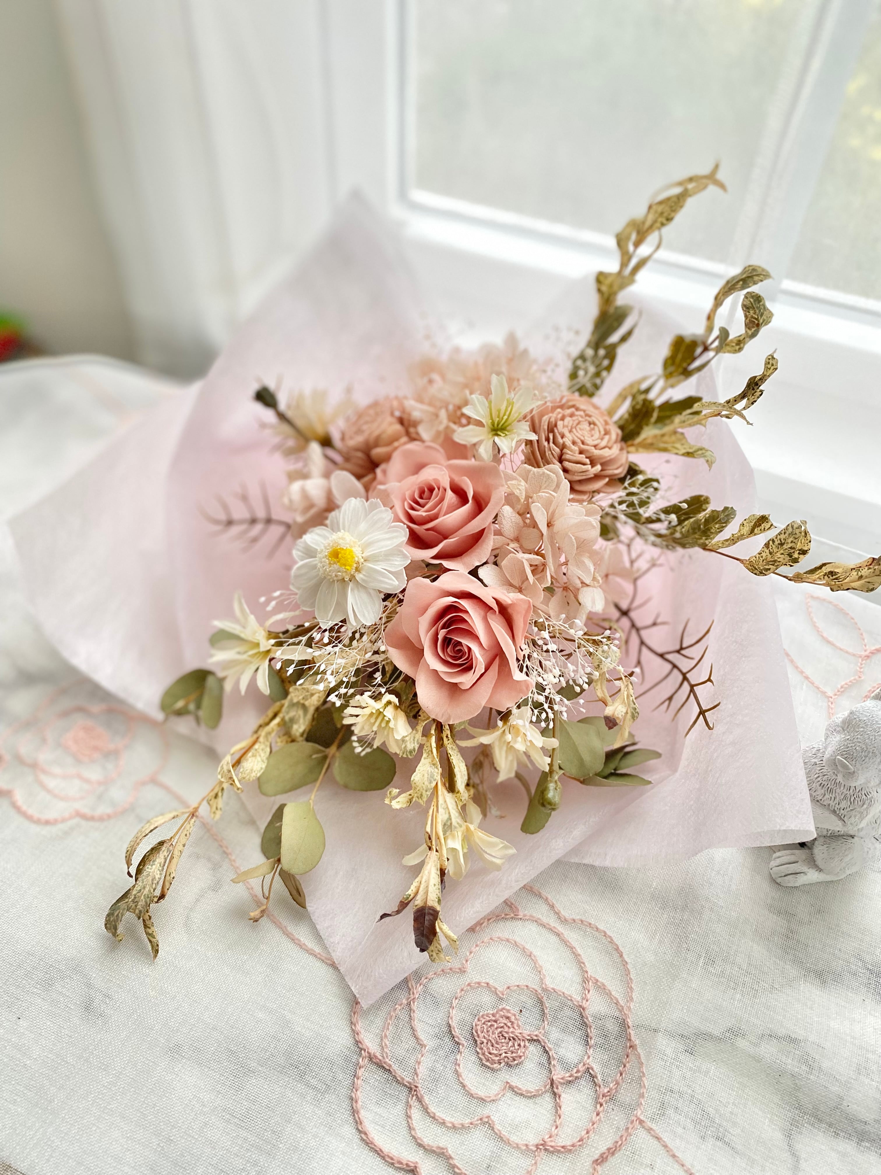 この花束は、結婚式や誕生日、お祝い事など、さまざまなシチュエーションにぴったり。特別な日の贈り物や、日常のインテリアとしても大変おすすめです。心をこめたギフトとして、大切な方へのサプライズを演出することができるでしょう。