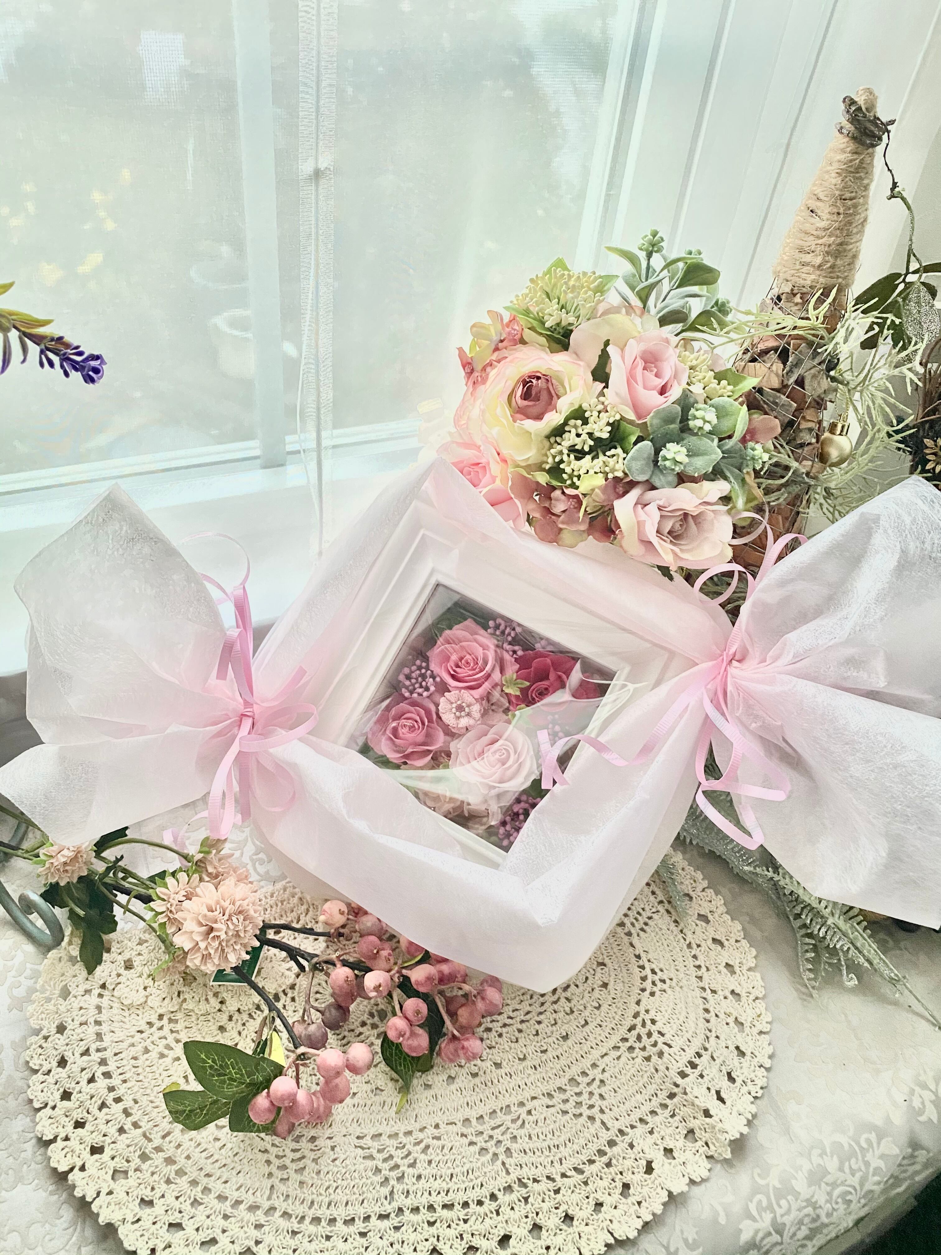 ■花材:プリザローズ プリザアジサイ 小花フェイク自然素材ドライフラワー リボンなど