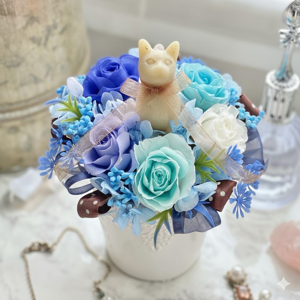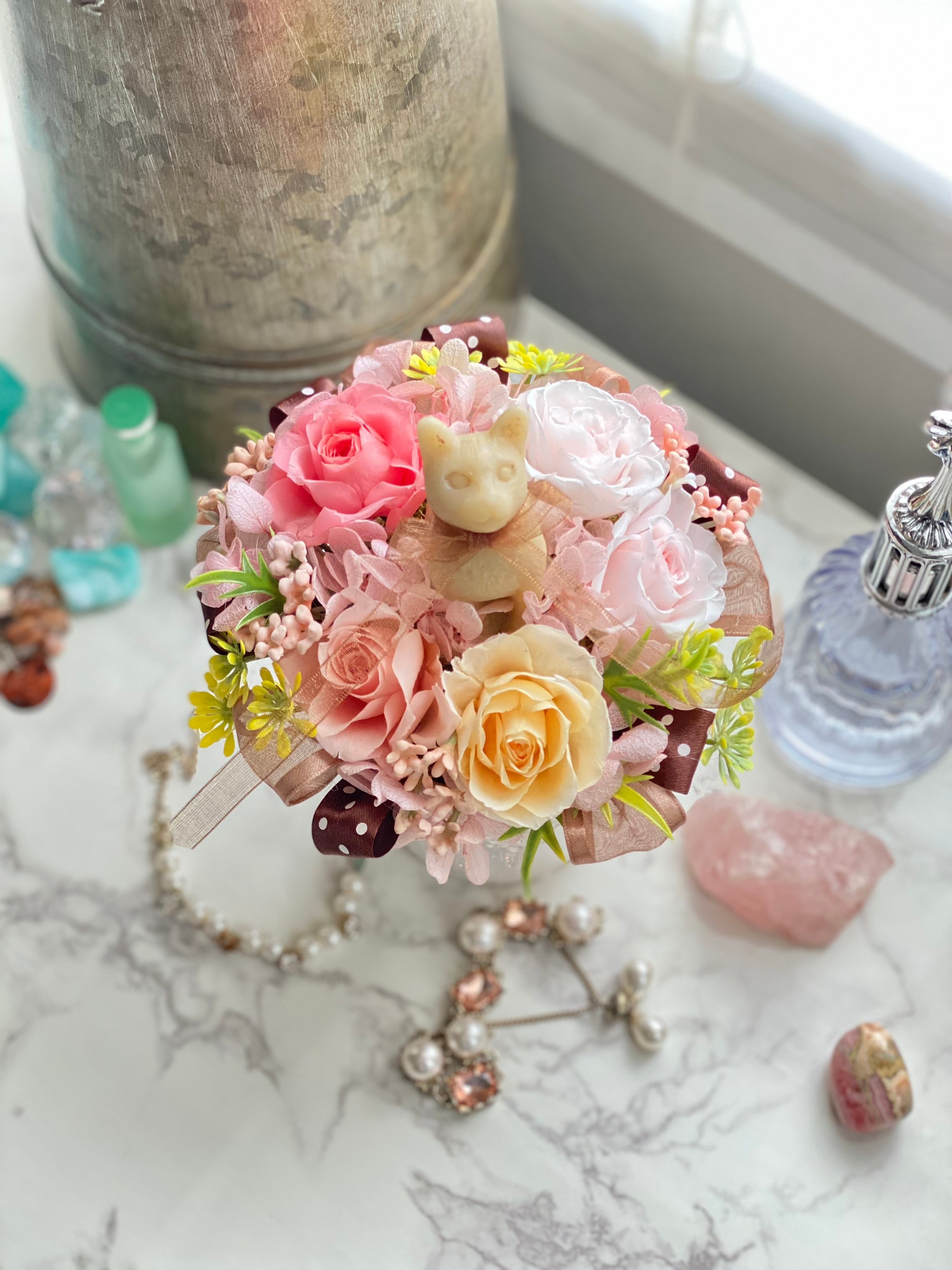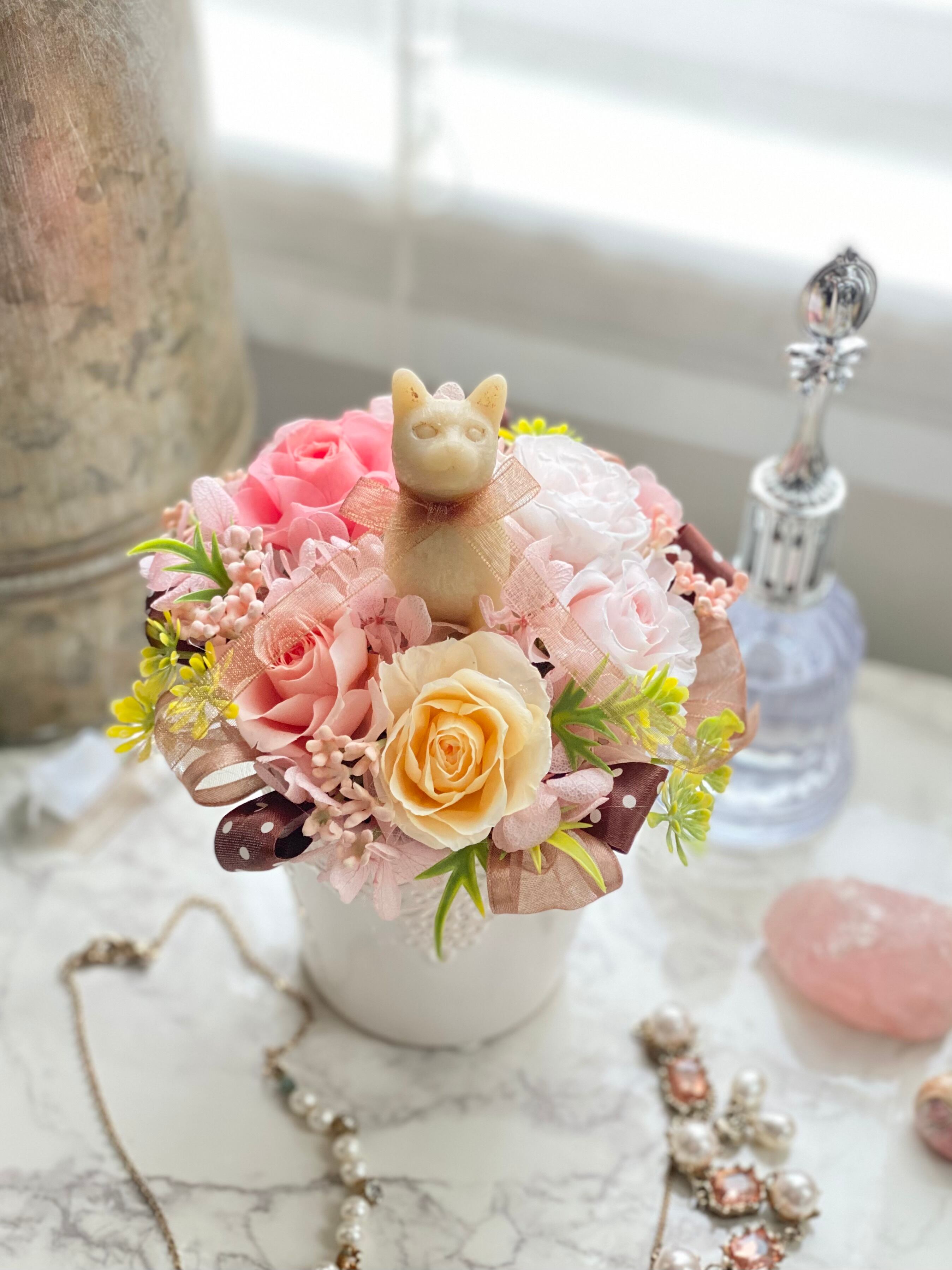 ■仕様:プリザローズ、プリザアジサイ、リボン、ベリーピック(花色に合わせて)ワックス製の猫