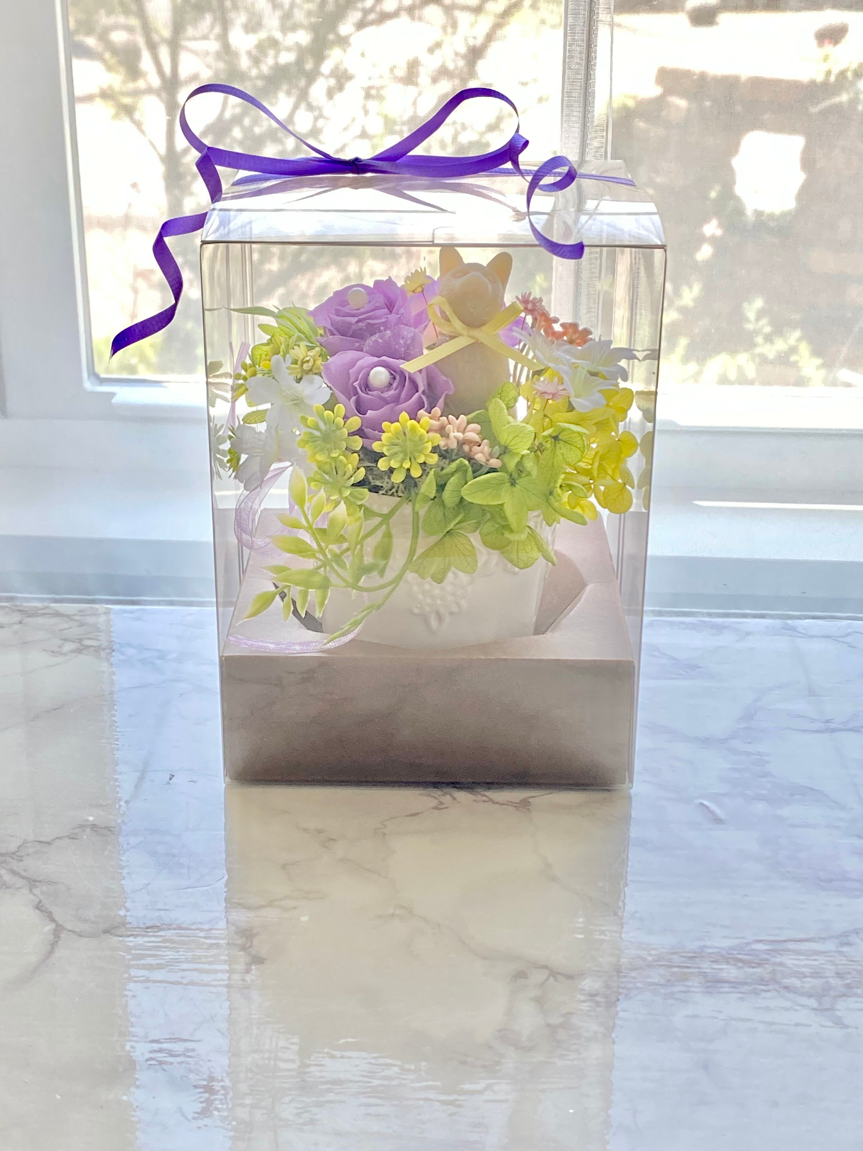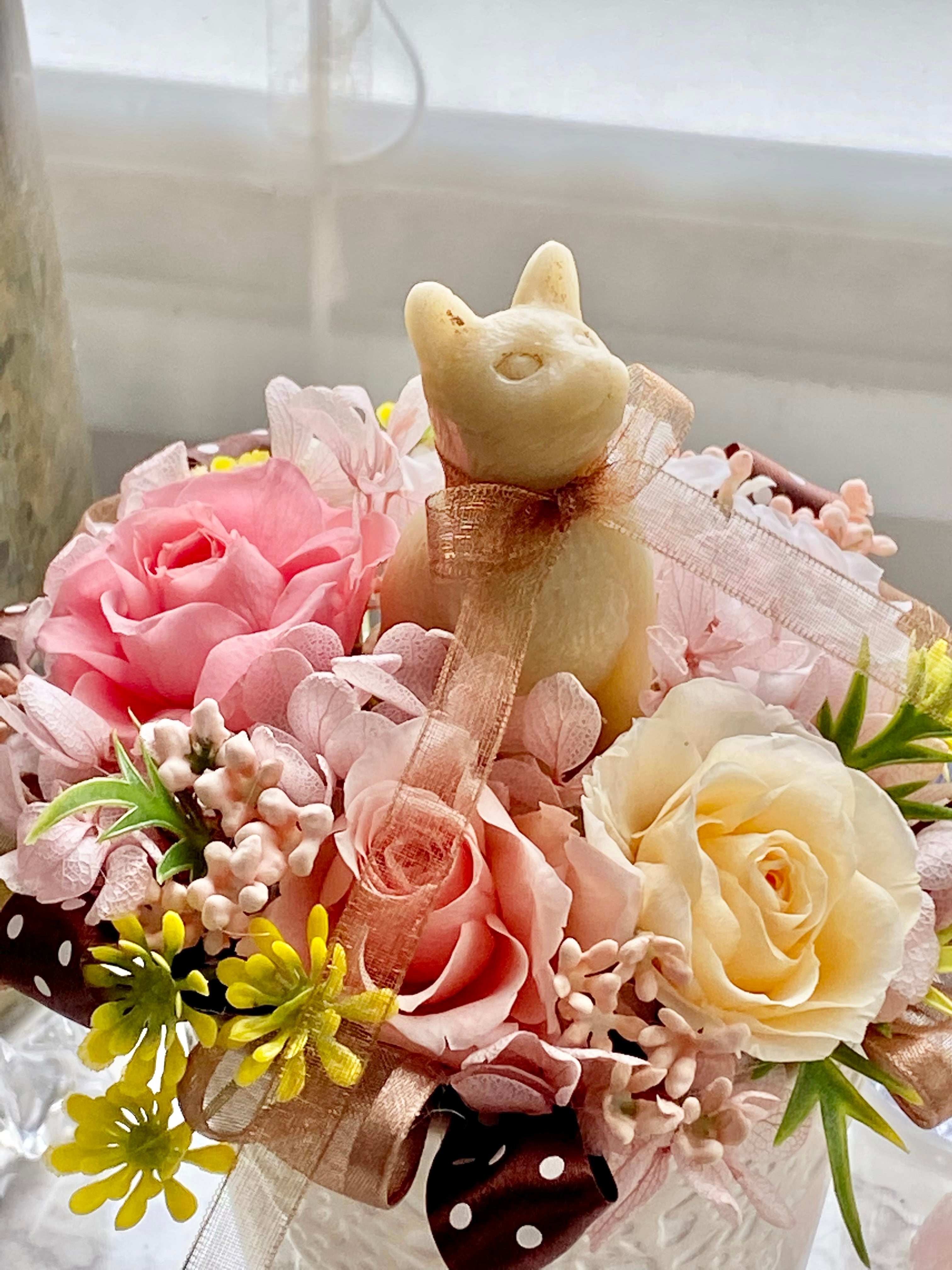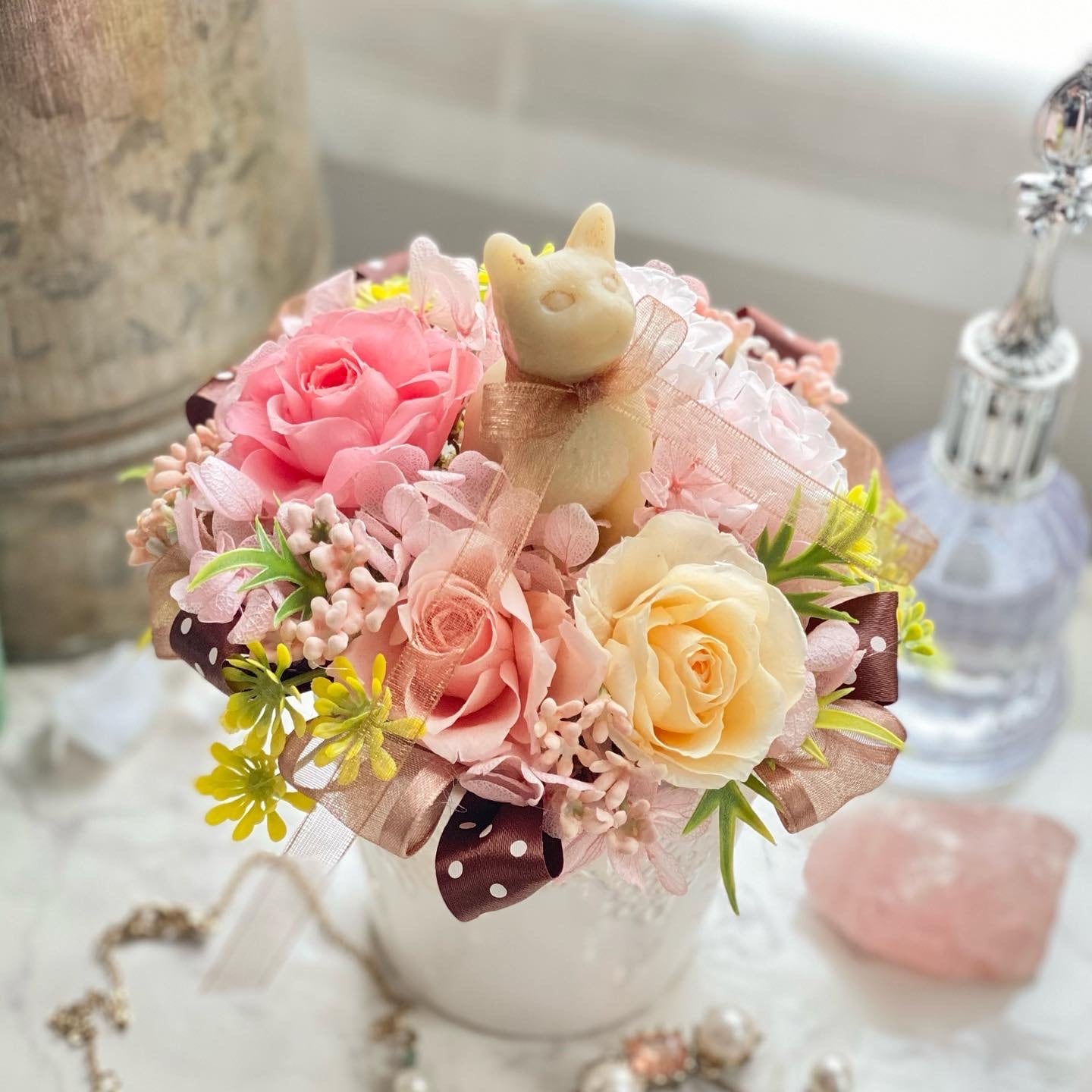 ■仕様:プリザローズ、プリザアジサイ、リボン、ベリーピック(花色に合わせて)ワックス製の猫