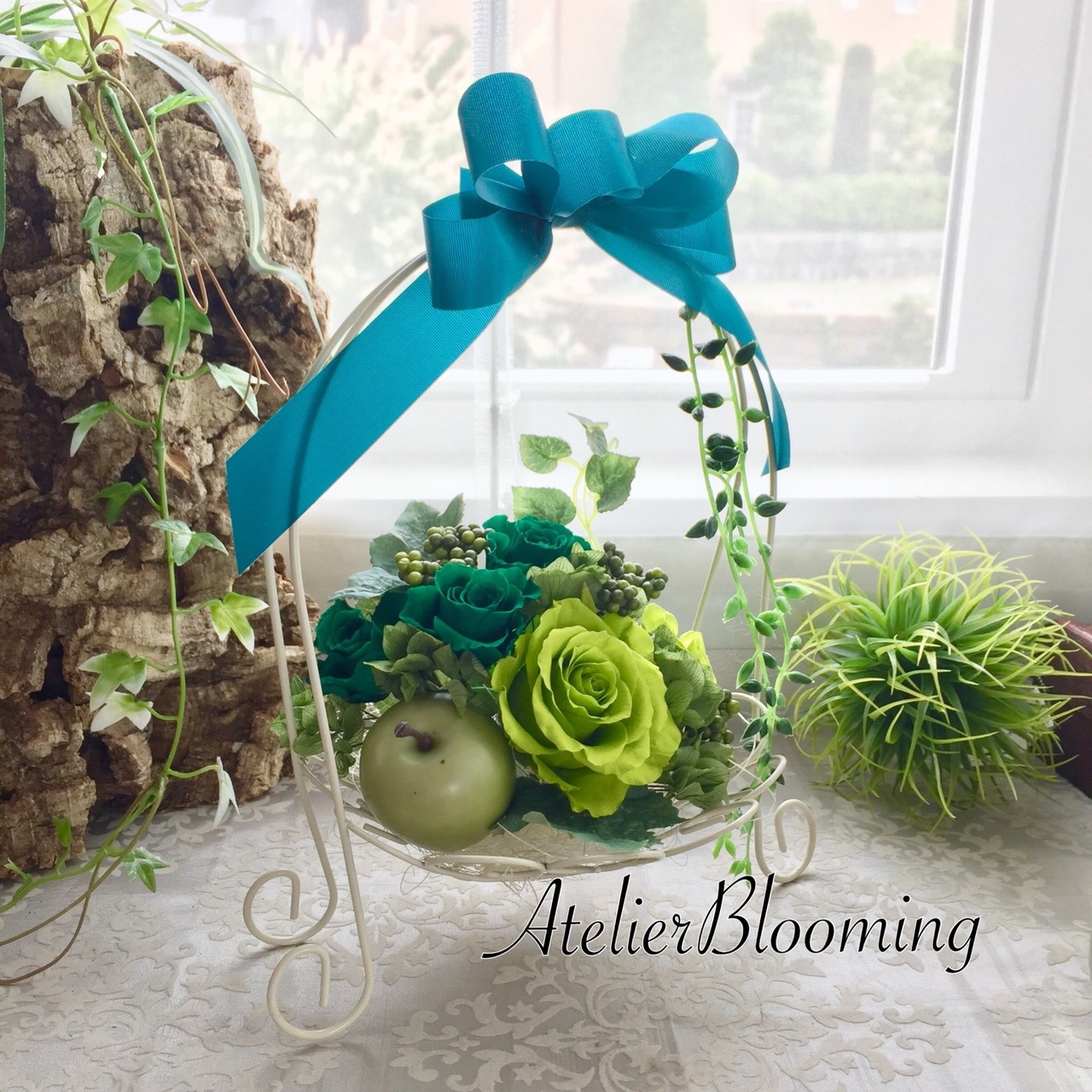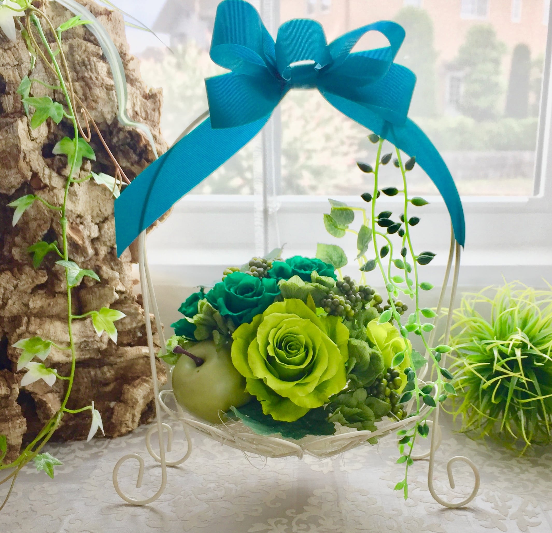 ■花材:プリザローズ プリザアジサイ ドライフラワー天然素材 リボン リーフ リンゴ(フェイク)などアイアン製のバスケット