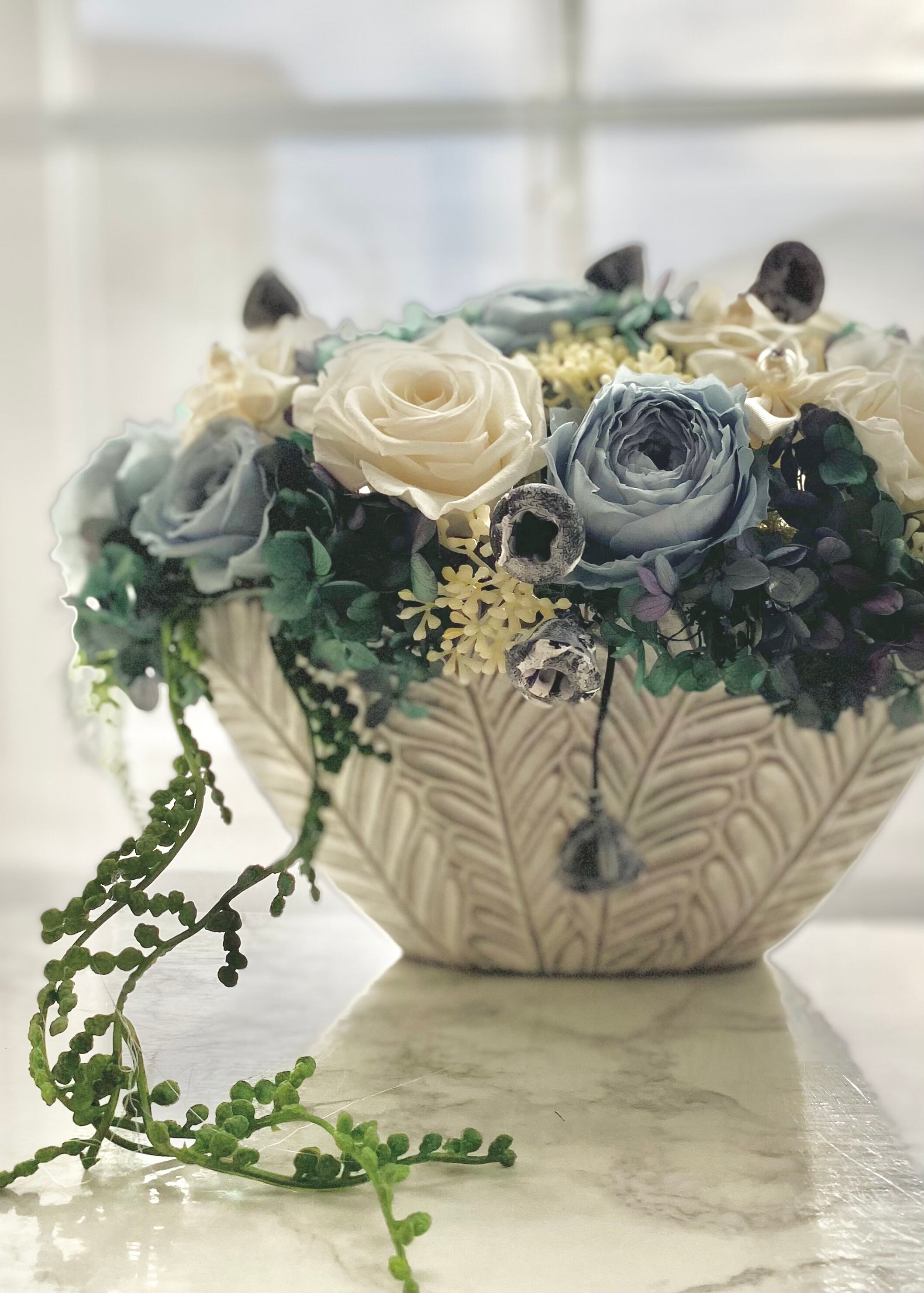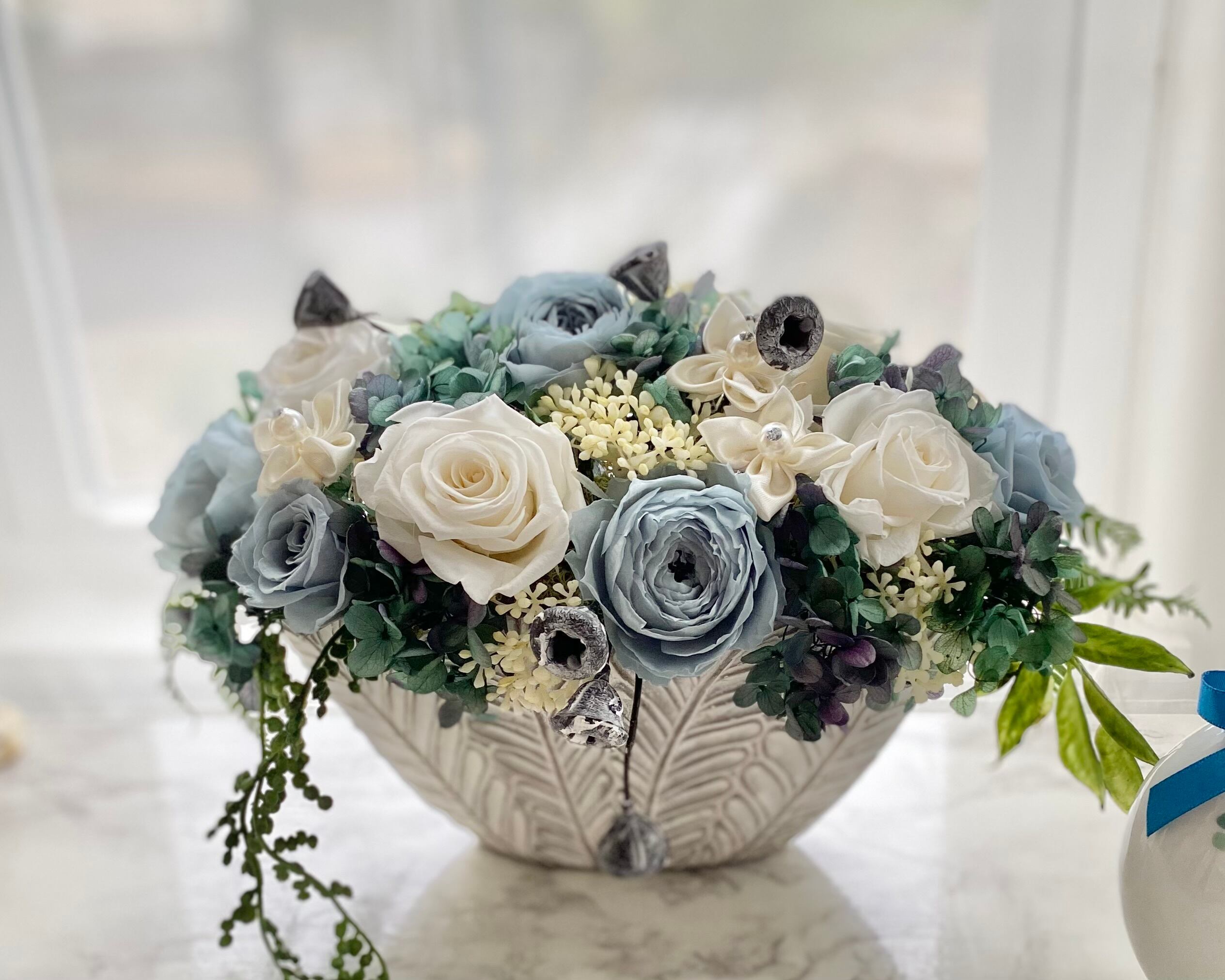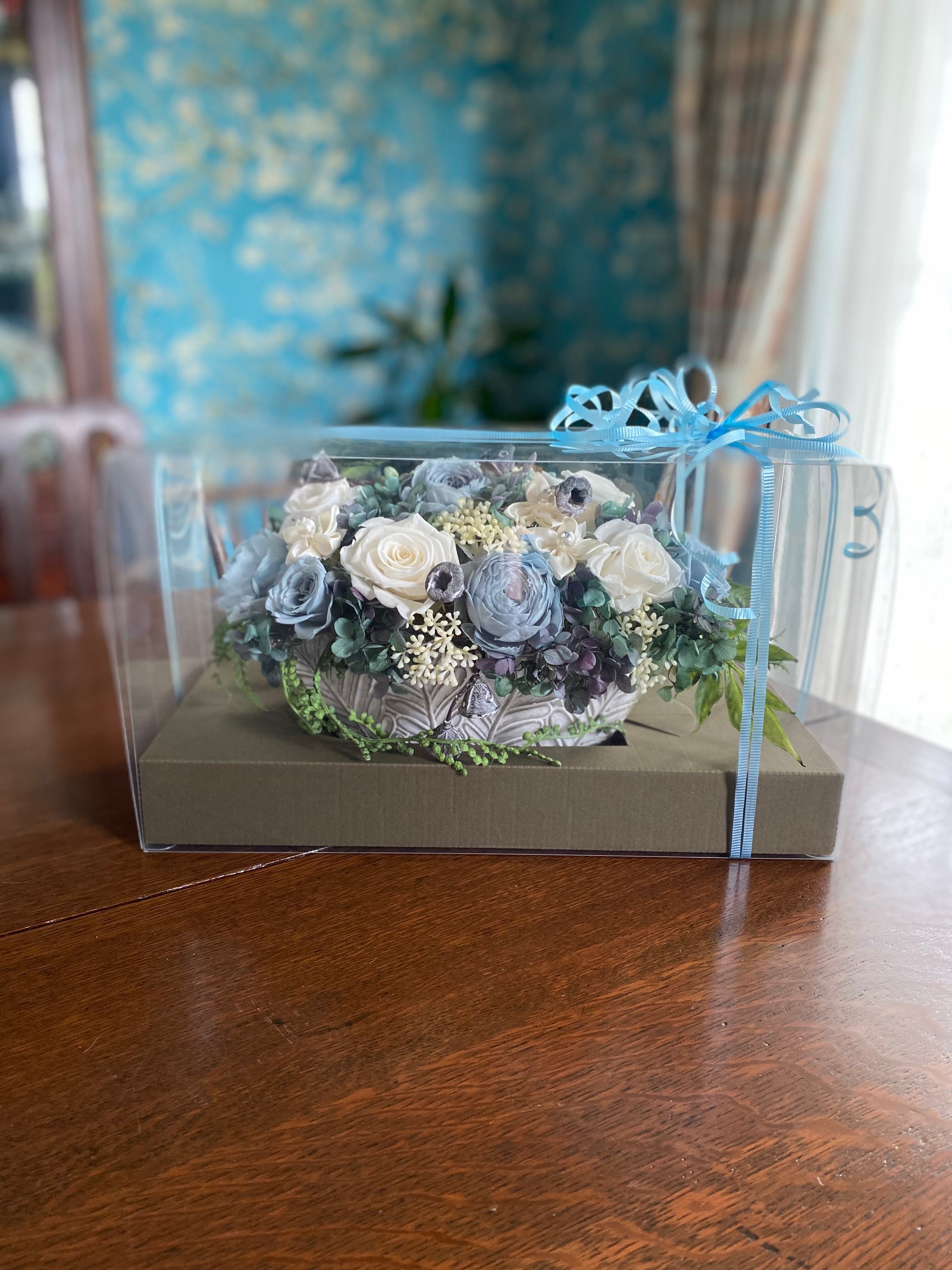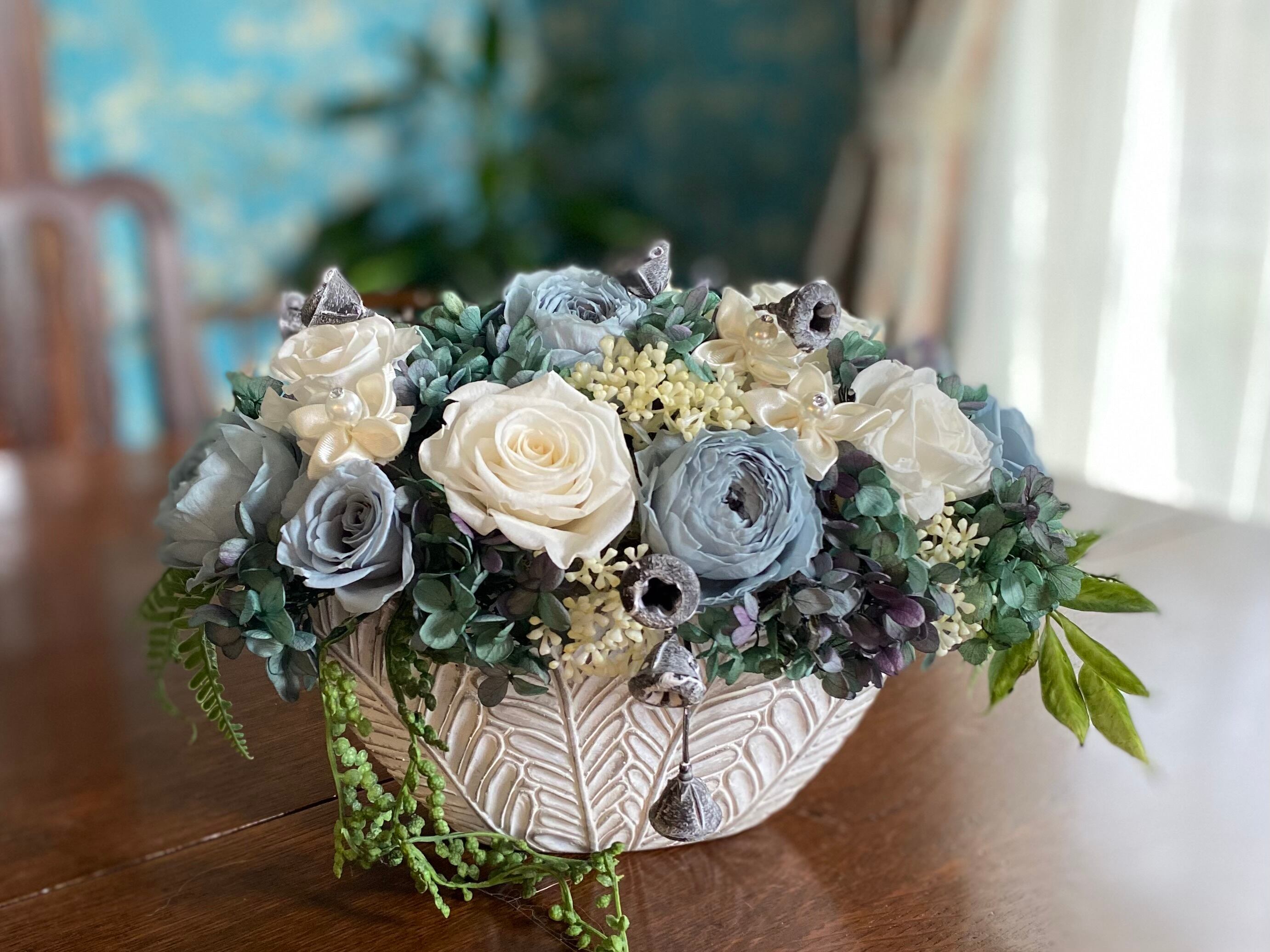 ■カラーについて:掲載品はブルー系とホワイト系のバラをメインにフェイクグリーンなどでまとめてあります。掲載品と同じお色はない場合がございます。お好みのお色などお聞かせください。お時間を頂ければ対応致します。