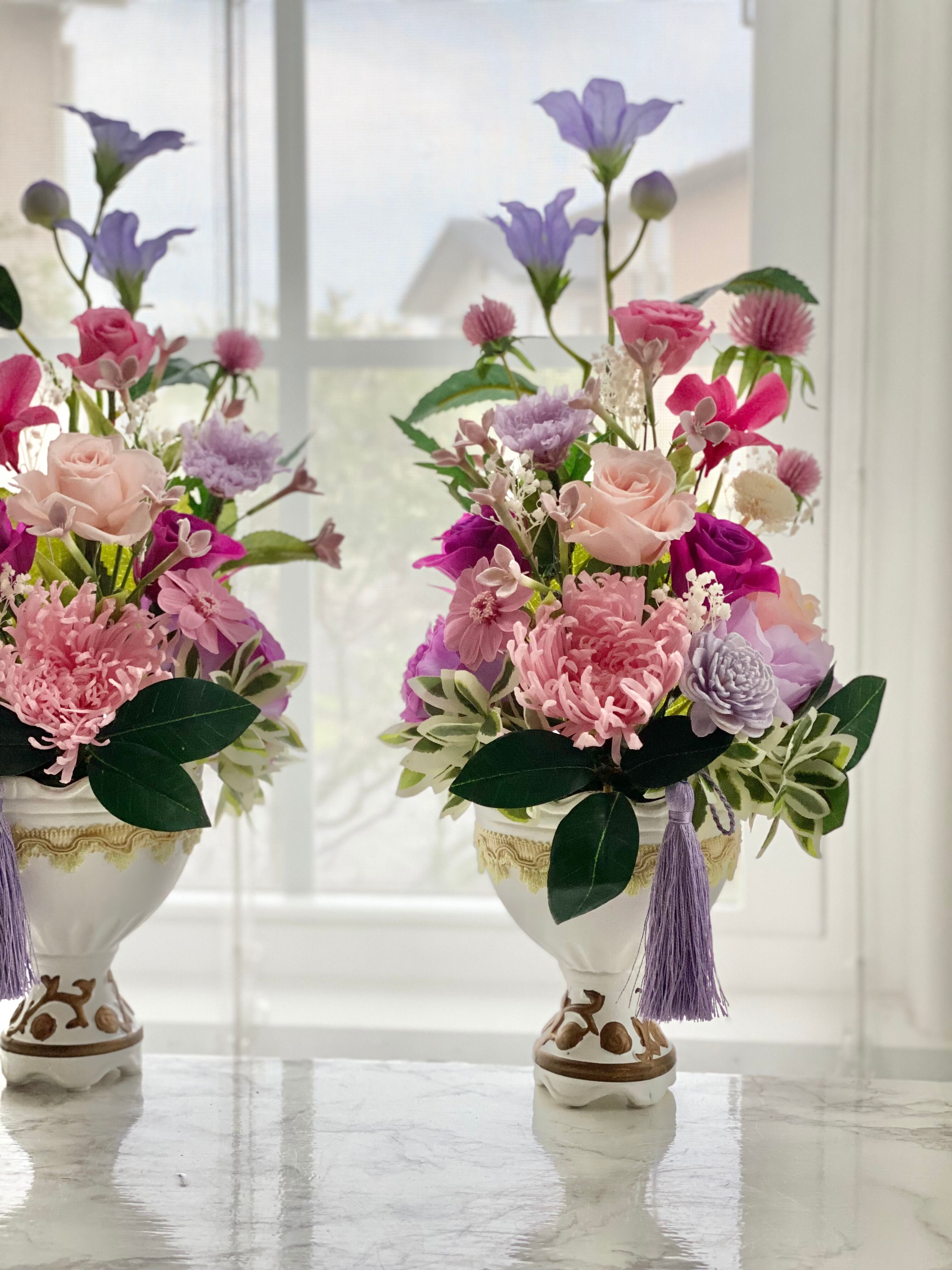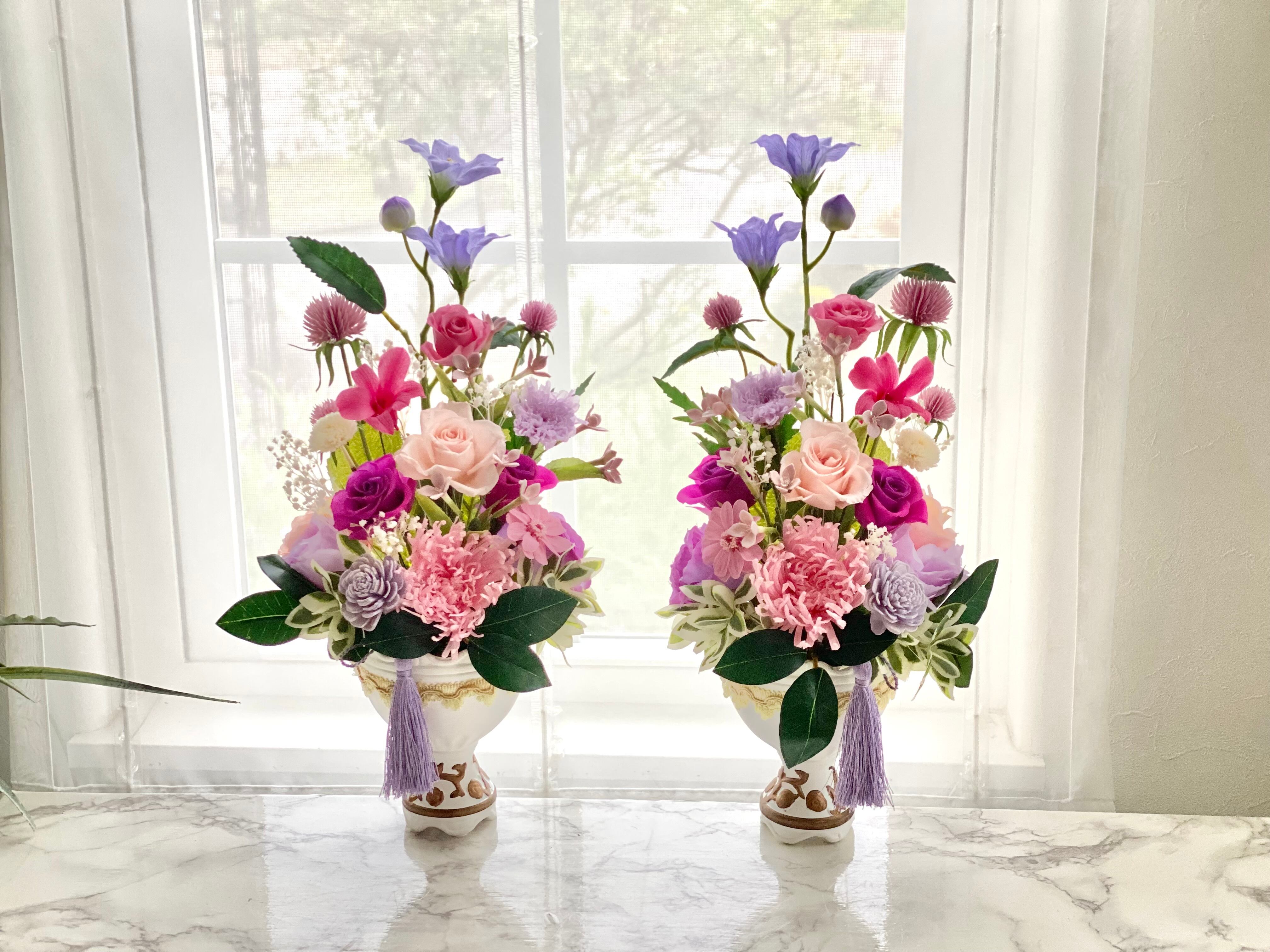 法要での祭壇や仏壇を装飾する際、左右に花を供えると見栄えが良いという理由で「一対」が基本となっているようです。一対でのご希望には,ご兄弟,ご親切,連名でのお供え花に多いようです。
